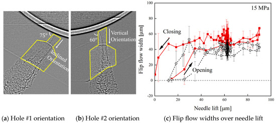 Figure 11 illustrates how the flip flow width in hole #1 and hole #2 changes with needle valve lift at an injection pressure of 15 MPa. It can be seen that at partial needle valve openings, the measurement variance is high across multiple tests, indicating that the flip flow state inside the nozzle is unstable at low needle valve lifts. This instability continues until the lift reaches about 40 μm. Beyond this point, the flip flow width stabilizes, and the measurement variance reduces. Even during needle valve overshoot, the flip flow width remains largely unchanged, with minimal variance. During the closing process, when the needle valve lift drops below around 20 μm, the flip flow width decreases rapidly, and the measurement variance increases again. This instability may be due to the gradual reduction in fuel pressure within the nozzle’s sac chamber during needle valve closure.