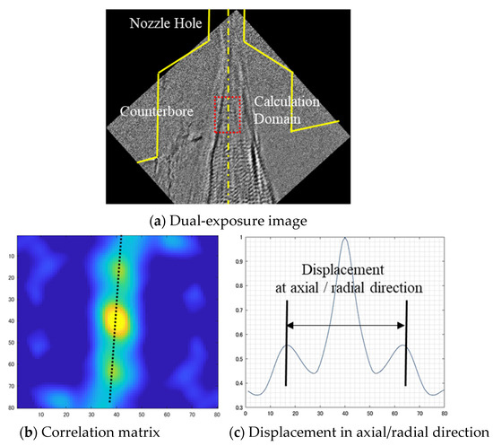 The dual-pulse synchrotron X-ray velocity measurement does not require tracer particles but instead uses the fuel jet’s structure to calculate the velocity. During the injection or spray breakup, the spray surface becomes unstable due to shear forces and fuel turbulence, causing liquid core breakup and forming discrete droplets. Using X-rays in dual-exposure mode, these surface distortions or droplets are captured twice on the same film (Figure 12a), providing dual-exposure images.