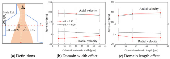 Using hole #1 as an example, this study examines the effects of domain area on the calculation results (Figure 13). Figure 13a shows the measurement positions, including the center () and outer edge () of the flow. As shown in Figure 13b, increasing the domain width slightly reduces both axial and radial velocities and increases the variance. This is due to the significant velocity gradient in the radial direction, where low-speed areas are included as the domain width increases, lowering the calculated velocity. Reducing domain width increases the computational load but improves efficiency. Thus, a domain width of 10 µm is optimal. Figure 12c shows that increasing the domain length slightly increases the axial velocity and reduces variance. This improves calculation reliability, and a domain length of 40 µm is recommended.