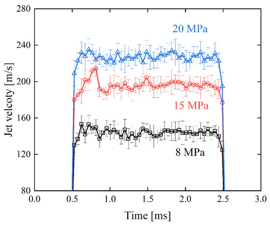 Figure 14 shows the variation in internal flow velocity in hole #1 with respect to the fuel injection duration. The measurement location of this internal flow velocity is at the center of the flow (r/R = −0.29) shown in Figure 13a. As seen in Figure 14, after the injection begins, the internal flow velocity rises rapidly and quickly reaches a stable state. During the initial phase of the velocity rise, which occurs between 0.5 ms and 1.0 ms of injection duration, there is a slight overshoot in the internal flow velocity. After this, the flow enters a steady state, with the internal flow velocity remaining almost constant, corresponding to an injection duration between 1.0 ms and 2.0 ms. The overshoot in internal flow velocity may be attributed to the needle valve’s own opening overshoot.