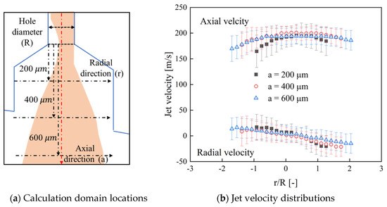 Figure 15 shows the radial distribution of fuel flow at different positions inside the nozzle and the counterbore: 200 µm (inside the counterbore), 400 µm (counterbore exit), and 600 µm (outside the counterbore). For convenience, these flow velocities are collectively referred to as internal flow velocities of the nozzle. The measurement locations for the internal flow velocities are shown in Figure 15a.