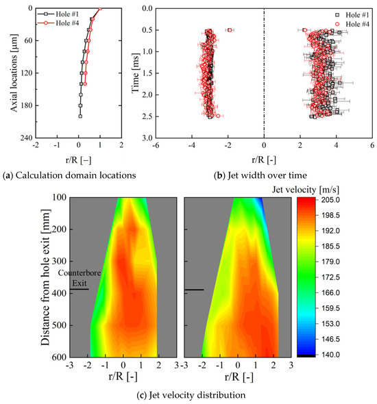 Figure 16 shows an analysis of the effects of the internal flow on the jet characteristics under an injection pressure of 15 MPa. As shown in Figure 15a, the flip flow width in hole #1 is wider than in hole #4. Additionally, due to the longer nozzle length of hole #1, the flip flow length inside hole #1 is also greater than that in hole #4. From Figure 16b, it can be seen that the jet width from hole #1 is slightly larger than that from hole #4. Both hole #1 and hole #4 show flip flow on their left sides. After exiting the nozzle, the fuel rapidly forms small droplets, which collide with the right wall of the counterbore. Consequently, the left-side boundary of the jets from both hole #1 and hole #4 aligns with the counterbore boundary. On the right side of the jets, away from the flip flow, the jet does not collide with the counterbore wall. Therefore, the jet boundary on the right side of hole #1 is farther out than that of hole #4, making the jet width from hole #1 larger than from hole #4. Fuel–wall collisions affect emissions and nozzle durability. Preliminary results show that counterbore diameter and initial conditions, like fuel and nozzle temperatures, play key roles. Further details will be shared in future studies.