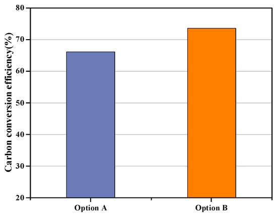Figure 3 presents the carbon conversion efficiency of the two process options. The carbon conversion efficiency of Option B is 73.97%, while the carbon conversion efficiency of Option A is 66.71%. Therefore, Option B is more competitive regarding carbon utilization potential. As can be seen in Figure 4, the process configuration in the biogas reforming and methanol synthesis units of the two options is the same. Therefore, the variation in carbon conversion efficiency between the two process options is seen in the H2 production unit. In detail, the amount of biogas consumed in this unit in Option A is 181.17 kmol/h, and that in Option B is 111.73 kmol/h. This is mainly because the hydrogen generated via the methane pyrolysis pathway is mainly derived from the methane. However, the hydrogen obtained via the chemical looping reforming pathway originates from methane and an oxidizing agent (i.e., steam). Thus, Option B has lower biogas consumption compared with Option A, resulting in higher carbon conversion efficiency.