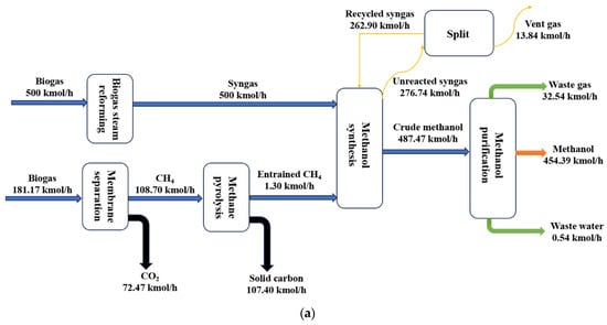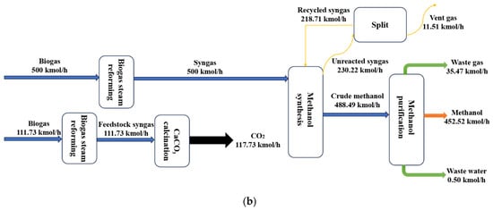 (a) Process flowsheet diagram of biogas-to-methanol process combined with methane pyrolysis technology. (b) Process flowsheet diagram of biogas-to-methanol process combined with chemical looping reforming technology.