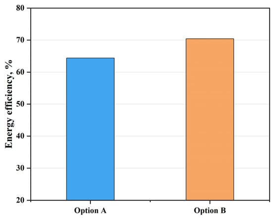 Figure 5 presents the energy efficiency of the two process options. The energy efficiency of Option A is 64.37%, while that of Option B is 70.41%. As mentioned above, their difference in this level is reflected in the heat duty of the energy-consuming equipment and the demand for the consumed biogas in the H2 production unit. More specifically, in Option A, the stream exiting the methane pyrolysis reactor is used to preheat its feed to minimize the external heat consumption of the energy-consuming equipment. However, the highly endothermic methane pyrolysis reactor still requires considerable external heat. According to the simulation results, the energy consumption of the methane pyrolysis reactor is 10.96 GJ/h. In Option B, the streams exiting the three reactors are also used to preheat the feed. Meanwhile, the reaction heat in the air and the fuel reactors is recovered to provide the endothermic calcination reactor and the preheater. In this situation, only the air preheater requires external heat in the H2 production unit, which is set to 5.20 GJ/h. In addition, as described in Section 3.1.1, Option B has a significant advantage over Option A in biogas consumption in the H2 production unit. Therefore, the closely associated LHV is lower than that of Option A by 10.43%.