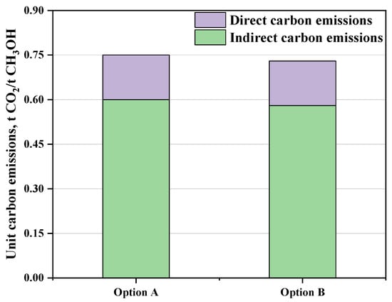 Figure 6 shows the unit carbon emissions of the two process options. The results indicate that the same direct CO2 emissions are observed in the two options proposed. However, Option B has lower indirect CO2 emissions than Option A by 4.31%, which is mainly ascribed to the lower level of heat consumption, as shown in Table 3. In two options, CO2 emissions from external fuel combustion are reduced by optimizing the initial heat exchanger networks. Nevertheless, the advantage of heat integration in Option B is more significant compared to Option A. As shown in Section 3.1.2, the heat consumption in Option B is reduced to 89.53 GJ/h through the cascade utilization of the waste heat. However, the heat consumption in Option A is still as high as 94.59 GJ/h due to the energy-intensive methane pyrolysis reactor. As a result, the resulting unit carbon emissions in Option B are lower compared to those in Option A in terms of 0.012 t CO2/t methanol. In addition, the electricity consumption in Option A is slightly higher than that in Option B by 0.64 GJ/h. This is mainly because the little unreacted methane, along with the desired H2, is compressed in Option A. The associated unit carbon emissions in Option B are lower than those in Option A in terms of 0.005 t CO2/t methanol.