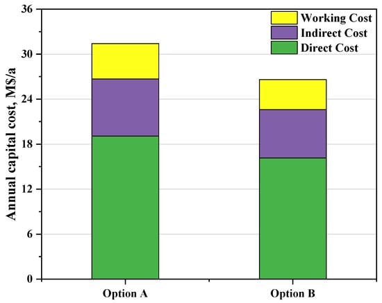 Table 4 presents the cost of major equipment for two options. As shown in the calculation result, Option A has more expensive devices than Option B. More specifically, on the one hand, the high-temperature operating temperature (1200 °C) of the methane pyrolysis reactor could result in higher design and manufacturing costs. Therefore, the cost of the methane pyrolysis reactor exceeds that of the three reactors in Option B by 5.47 M$. On the other hand, the significant advantages of the chemical looping reforming technology lie in the in situ separation of H2 and CO2. The feedstock pretreatment device is not necessary. However, for the methane pyrolysis technology, CO2 needs to be separated from the feed biogas to avoid CO2 being reduced to CO in the reactor, which affects the subsequent adjustment of the hydrogen–carbon ratio. Hence, the cost of the relevant purchased equipment in Option B is lowered by 2.98 M$. Based on the equipment cost mentioned, the annual investment cost of the two process options is calculated further, and the result is shown in Figure 7. The annual capital investment of Option B is lower than that of Option A by 4.80 M$/a owing to lower equipment cost. Therefore, Option B is more competitive than Option A in terms of annual investment cost.