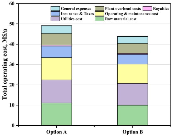 The total operating costs of the two process options are illustrated in Figure 8 and Table 5. As can be seen in this figure, the total operating cost of Option A is determined to be 49.13 M$/a, whereas that of Option B is identified to be 43.80 M$/a. Consequently, Option B has notable advantages compared with Option A in terms of the total operating cost. As described above, the higher carbon conversion efficiency of Option B means less biogas consumption, reducing the cost of raw materials by 1.15 M$/a. Moreover, the stronger heat integration ability in Option B further reduces the external fuel consumption, lowering the utility cost by 0.35 M$/a. In addition, Option B has a lower investment cost than Option A. Therefore, the closely related operation and maintenance costs, as well as other costs, are reduced by 1.49 M$/a.