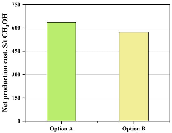 The net production costs of two options are shown in Figure 9. Generally, the net production cost is composed of the mentioned total production cost together with total production revenue. In the following content, the economic performances of two options are compared from three mentioned aspects. In terms of the total production cost, Option B has a 12.24% lower total production cost compared with Option A. This is attributed to the lower annual capital investment and total operating cost. In terms of the total production revenue, the product benefit of Option A is mainly obtained by selling the solid carbon generated in the methane pyrolysis reactor and the CO2 separated from the biogas. The product benefit of Option B is primarily derived by selling CO2 generated in the fuel reactor. However, compared with the highly purified CO2, the carbon black has higher economic values. Therefore, the total production revenue of Option A exceeds that of Option B by 16.26 USD/t CH3OH (see Table 6). Considering the total production cost and the product revenue together, the net production cost of Option B is lower than that of Option A by 64.82 USD/t CH3OH. Although the total production revenue of Option B is superior to that of Option A, the resulting small margin (16.26 USD/t CH3OH) hardly makes up for the gap between total production costs (81.08 USD/t CH3OH). Overall, Option B has stronger economic competitiveness in comparison to Option A when assessed in terms of economic feasibility.