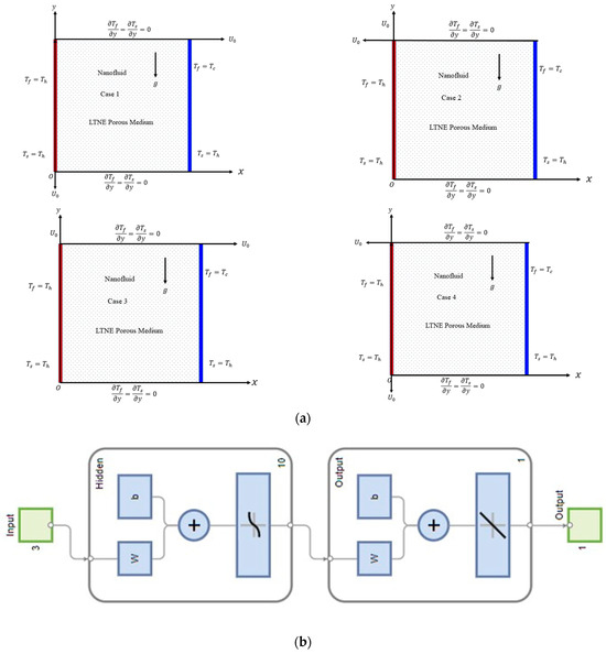 The geometry of the problem and the neural network architecture for the present model are depicted in Figure 1a,b, respectively. The computational domain consists of a double-lid-driven enclosure filled with a porous medium. The left- and right-side walls of the enclosure maintain constant temperature distributions, (), respectively, while the upper and lower edges are thermally insulated. The top and left-side edges move with a uniform velocity, , and several scenarios are considered based on the direction of their motion. These scenarios include the following: