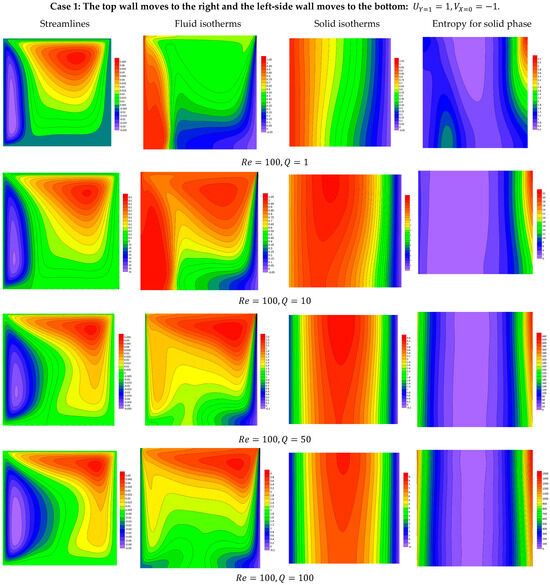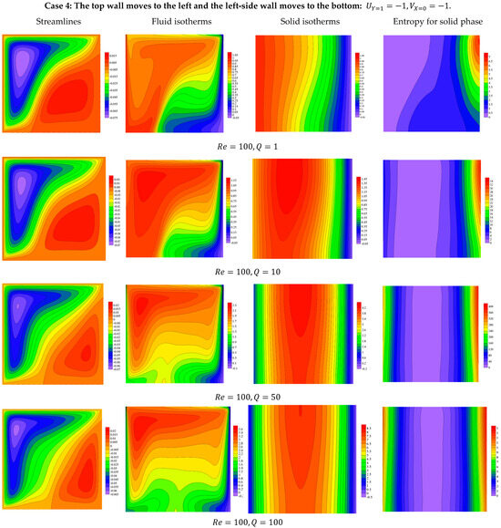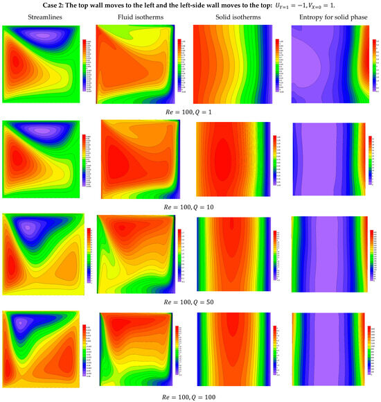 For Case 2, where the top wall moves in the inverse direction of the -axis and the left-side wall moves in the positive direction of the -axis (, the features of the streamlines and fluid/solid isotherms and the entropy property for the medium phase under the impacts of the governing parameters and are depicted in Figure 6, Figure 7, Figure 8 and Figure 9. Here, the flow structures differ from the previous case, where the major anticlockwise eddy is seen near the left-side edge and the minor clockwise eddy is noted close to the top edge. Also, the most heated zone occurs near the left-side boundary, indicating a good convection area, while the irreversibility of the solid phase occurs near the right-side edge. Like the previous case, the increase in either or the Rayleigh number causes an enhancement in the temperature difference, which results in an improvement in buoyancy force and natural convection mode. When both the heat generation parameter and the Rayleigh number are high, the following results are observed: