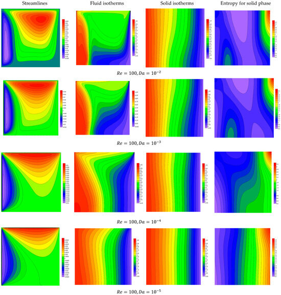 Figure 2, Figure 3, Figure 4 and Figure 5 show features of the streamlines, fluid isotherms, solid isotherms, and the entropy for the solid phase for Case 1, where , against the variations in , and . These illustrations are performed as a referenced case, where It is remarkable that the flow shows a major anti-clockwise eddy due to the top wall movement and a minor clockwise eddy due to the left-side wall movement. Also, the convection mode is dominant on the fluid isotherms, while the conduction mode is dominant on the solid isotherms. Furthermore, the solid phase irreversibility is seen within the entire domain, but the isotherms gather near the cold wall (right-side edge of the domain). The results highlight the complex flow and thermal behavior in the system. The dominant anti-clockwise eddy driven by the top wall movement reflects the primary circulation, while a minor clockwise eddy near the left-side wall indicates localized recirculation. In the fluid region, heat transfer is primarily governed by convection, as indicated by the fluid isotherms, whereas in the solid region, conduction dominates due to the absence of fluid motion. The solid phase exhibits entropy generation across the domain due to temperature gradients, with irreversibility clustering near the cold wall (right-side edge), signifying high thermal gradients and localized energy losses. These findings provide valuable insights into optimizing heat transfer and minimizing entropy generation in similar systems. The findings also disclose that the rise in the heat generation coefficient, , causes an enhancement in the activity of the motion due to the improvement in the temperature differences. A good isotherms domain is obtained as increases due to the additional heat generation within the domain. Further, the irreversibility due to the solid phase rises as increases due to the rise in the temperature gradients. In the same context, the variation in the Darcy number values (from to causes the flow to diminish, and the forced convection becomes dominant. Also, both the fluid and medium isotherms and solid phase entropy reveal that the conduction case controls at the lower values of compared to the convection mode. All these features are due to the decrease in the medium permeability as is decreased. Regarding the variation in , the illustrations show that the flow becomes more viscous due to the increase in and hence the mixed mode diminishes. Regarding the variations in the Rayleigh coefficient, the figures illustrate that the low values of indicate that the forced mode controls the flow domain, while the increasing value of Ra indicates that the buoyancy-driven flow is dominant.