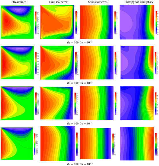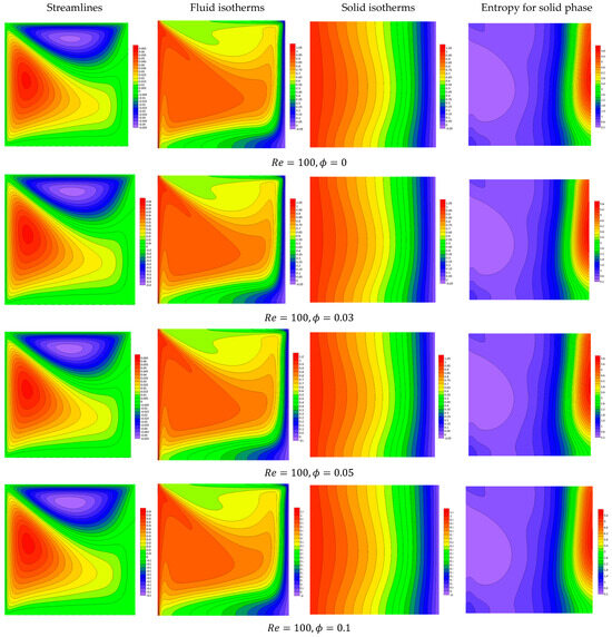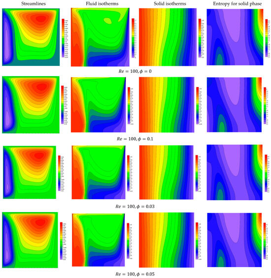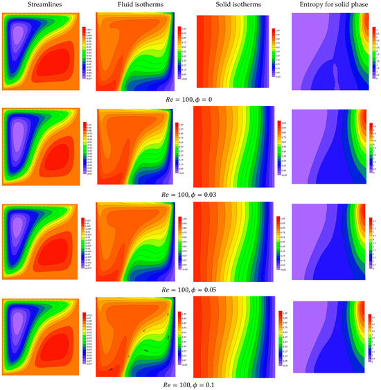 This division presents a discussion of the given outcomes. In this investigation, the results are presented for four cases, and the roles of the aforementioned parameters—the heat generation parameter ; the Darcy number (; the nanoparticle volume fraction the Rayleigh number for the streamlines, fluid isotherms, and solid isotherms; the entropy for the solid phase; and the local Nusselt numbers for the liquid and medium phases—are studied.