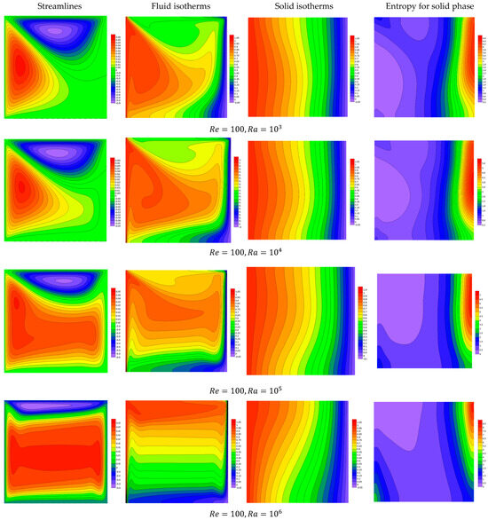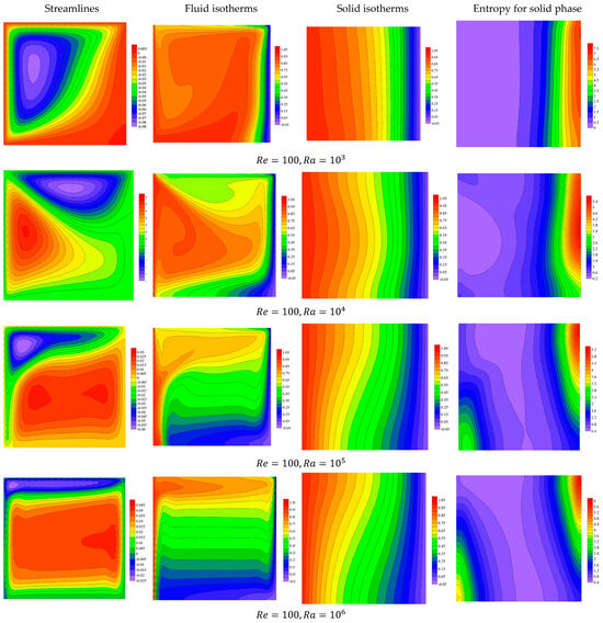 Features of streamlines and isotherms for the fluid and solid phases and the solid phase entropy for various values of Ra at .