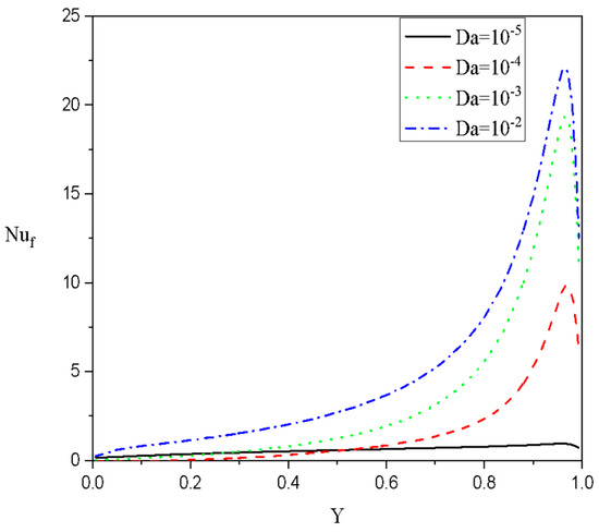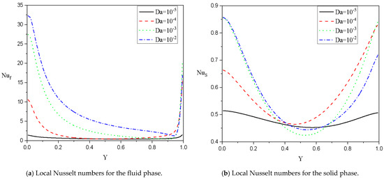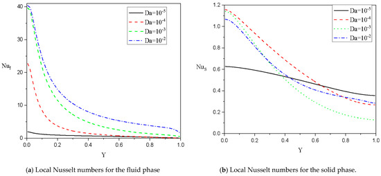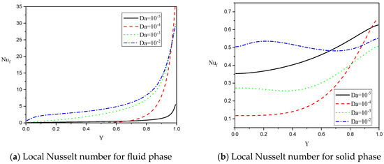 For Case 2: , the behaviors of the local Nusselt numbers for the liquid and medium phases under the impact of the Darcy coefficient are depicted in Figure 16. For these conditions, the maximum values of occur near the bottom wall while has a minimum value that occurs in the middle of the lower edge. We can note that the increase in causes an improvement in gradients of the fluid temperature and hence is augmented. Also, near the bottom wall, enhances as grows due to the dissipation effects. In a related context, Figure 17 shows the local Nusselt quantity along the heated wall for the fluid phase for several values of at and Case 2: It is noticeable that the temperature differences are improved as is altered, and hence the rate of heat transport is augmented.