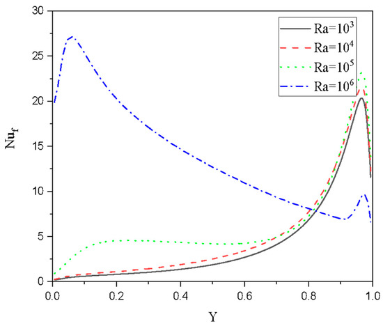 Figure 18 displays the local Nusselt values along the heated boundary for the liquid and medium phases for various values of at and Case 3: . It is noted that gradually increases as is enhanced, while only the lower part of the left-side edge is enhanced as Da is altered. By comparing and in this case and in the previous case (, we can note that the rate of the heat transport is higher in Case 3, where . Figure 19 shows the local Nusselt quantity in the heated part of the system for the fluid phase for several values of at and Case 3: The figure shows a good enhancement in as is altered because of the thermal boundary layer’s thickness.