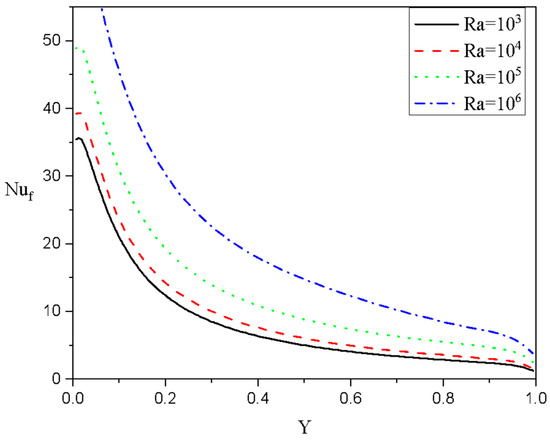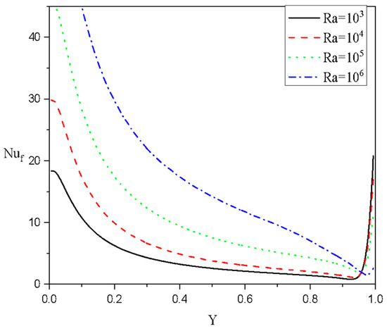 Figure 14 shows the local Nusselt values for the fluid phase along the active edge for several values of at , and Case 1: We can note that the lower values of cause a gradual increase in due to the increase in the gradients of the fluid temperature. For the same case (Case 1: ), profiles of the fluid–Nusselt coefficient for several values of at and are presented in Figure 15. It is observed that increases with due to the growing convective situation while the higher values of ( cause an extra increase, and thus the profile is reversed.