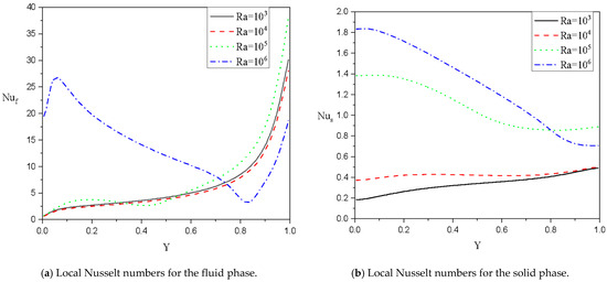 Local Nusselt numbers along the heated wall for fluid and solid phases for various values of at . Case 3: .