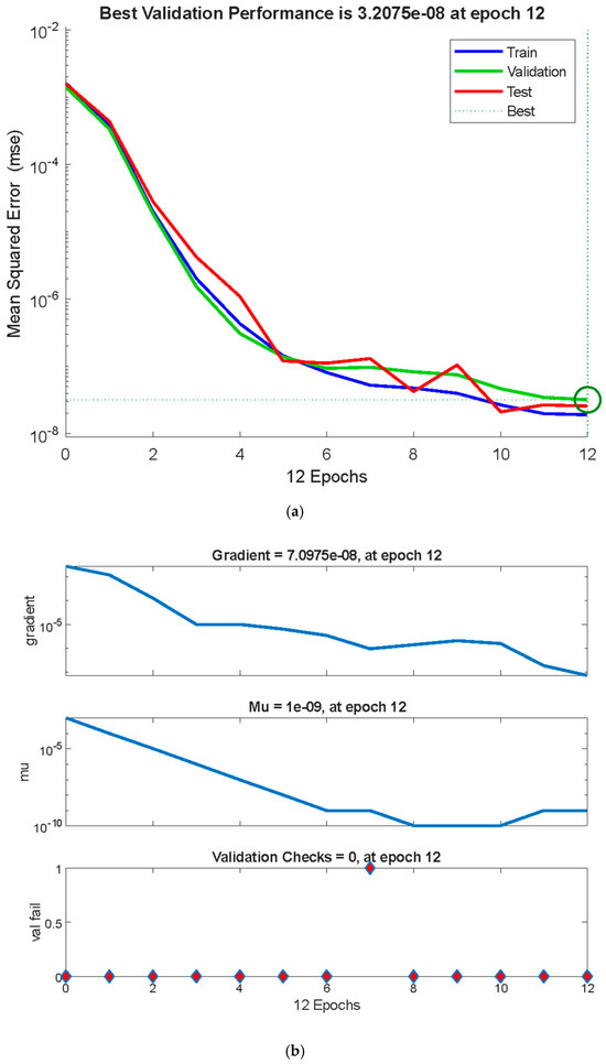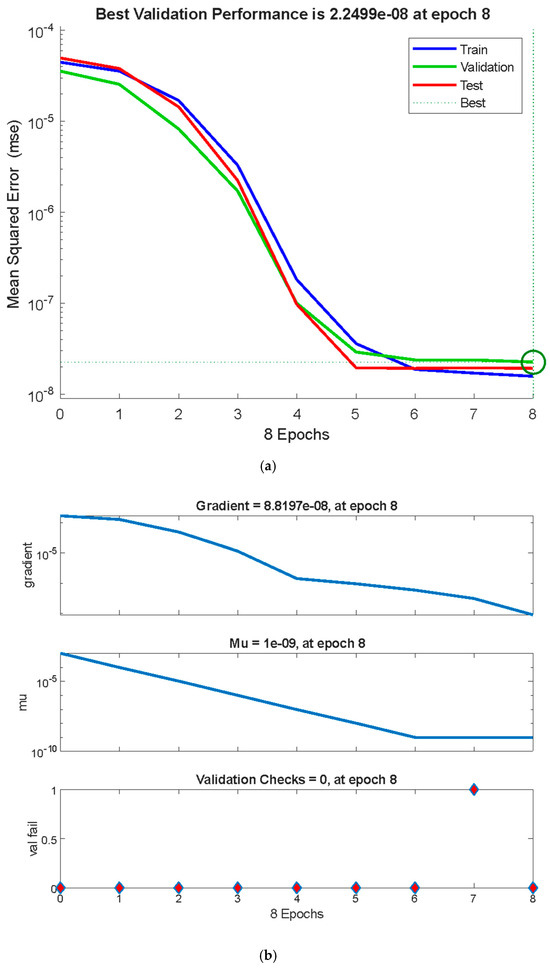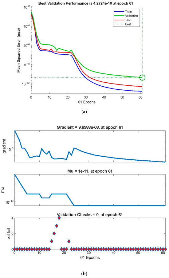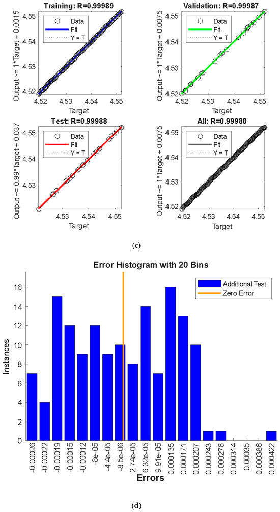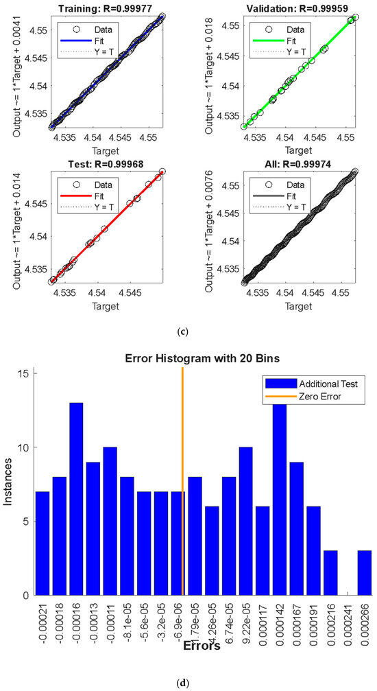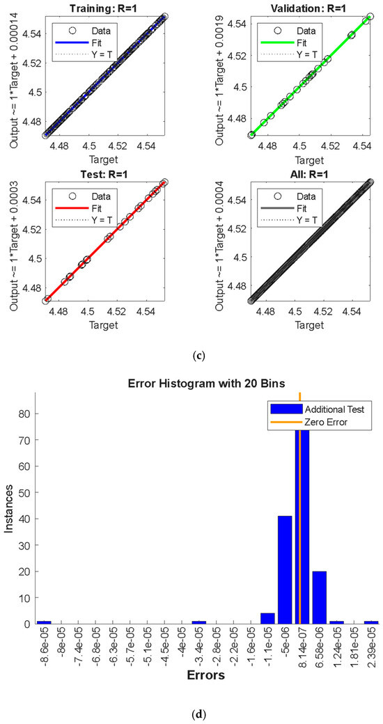 (a) MSE values for parameter . (b) Performance in the form of “gradients”, the control parameter “mu”, and the “validation check” of the backpropagation algorithm for parameter . (c) Regression diagram for parameter . (d) The differences between the predicted and target values for each dataset for .