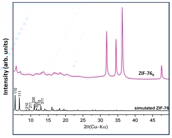 To investigate the effect of temperature on the yield improvement of ZIF-76, the reaction was conducted under the same conditions as Run 1 but with heating at 80 °C. Within 24 h, the formation of a white precipitate was observed. The results revealed a significant difference in yield with ZIF-76AR showing an approximately 80% reduction in yield compared to ZIF-76A. In addition, the PXRD analysis, as shown in Figure 2, indicates that ZIF-76AR primarily consisted of zinc oxide (ZnO) along with some unidentified phases and weak diffraction peaks compared to the simulated pattern of ZIF-76.