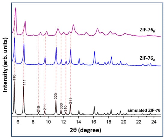 XRD of simulated ZIF-76, ZIF-76A (Run 1), and ZIF-76B (Run 2).