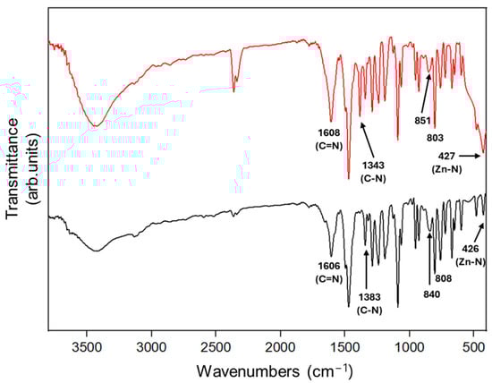 The synthesis of ZIF-76 resulted in the appearance of new peaks and noticeable peak shifts. For instance, the peak representing C-Cl of the halo compound shifted from 850 cm−1 in 5-chlorobenzimidazole, as shown in Figure S1 of Supplementary Information, to 851 and 840 cm−1 in the ZIF-76 spectra. Meanwhile, the FTIR spectra of ZIF-76A and ZIF-76B in Figure 4 confirmed the formation of MOFs. Overall, both samples exhibited comparable spectra, with no significant differences observed between them. Several prominent absorption bands were identified, indicating the structural similarity of the two materials. The in situ synthesis in this work utilized aqueous NaOH to promote the coordination of imidazolate-based linkers and metal ions, leading to the formation of ZIF-76 crystals. For example, ZIFs are typically characterized by the presence of prominent peaks at 808–803 cm−1, which are associated with strong H-bonding within the framework. These features arise due to enhanced nucleation and coordination facilitated by the addition of NaOH as a modulator. On the other hand, the stretching vibration of Zn-N can be identified by the presence of a peak at 427–426 cm−1.