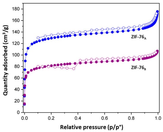 ZIF-76A and ZIF-76B were further analyzed using the N2 adsorption isotherm, and the resulting curves are presented in Figure 5. Both samples demonstrated a Type I N2 adsorption–desorption isotherm, based on the IUPAC classification. This indicated the microporous characteristic of the materials. In general, Type I is marked by a rapid intake of N2 at very low relative pressures (p/po < 0.3), which occurs due to multidirectional interactions between the pore walls and adsorbate []. Meanwhile, the hysteresis loop observed can be caused by the capillary condensation []. ZIF-76A exhibited higher N2 adsorption than ZIF-76B. These phenomena were further confirmed by the increase in volume of N2 adsorbed at low relative pressures (at p/po < 0.025).