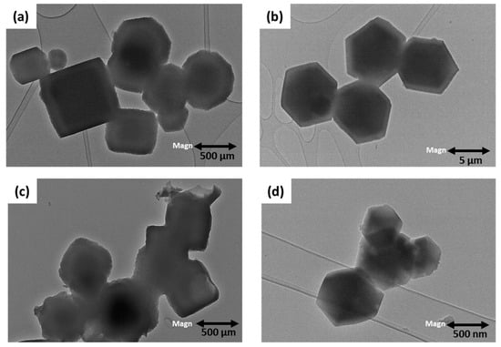 The particle size and morphology of both ZIF-76A and ZIF-76B were studied using TEM, as shown in Figure 6. The images revealed that ZIF-76A exhibited consistent hexagonal and cubic shapes with a uniform particle-size distribution as can be observed in Figure 6. The particle size of ZIF-76A was determined to average 631 nm, based on the analysis of 103 particles, which was larger than previously reported values []. On the other hand, ZIF-76B was found to exhibit a mixture of shapes including hexagons, needle-like structures, cubes, and spheres, as shown in Figure S2. Figure 6c,d displays the irregular formation of hexagonal structures in ZIF-76B, in contrast to the well-defined and perfect shapes exhibited by ZIF-76A. This observation suggests a retardation in the particle formation process of ZIF-76B, likely caused by the presence of excess linkers. The excess linkers may hinder the uniform formation of MOF particles, resulting in the diverse morphologies observed under TEM. An off-stoichiometric ration can disrupt the balanced coordination environment that is required for uniform particle growth which in turn leads to irregularities in morphology and particle size. Due to inconsistencies in the shape of ZIF-76B, the particle size distribution was not provided. The observed variation in the shape and particle-size distribution of ZIF-76B could be affected by the changes in precursor ratio.