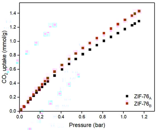 Single-CO2 adsorption isotherm of ZIF-76A and ZIF-76B at 298.15 K under pressure ranging from 0–1 bar.