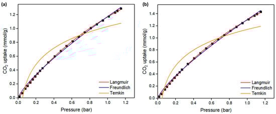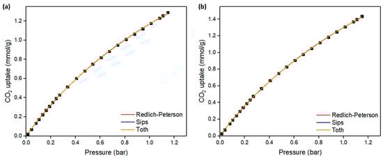 Adsorption isotherm models play a crucial role in understanding the interaction between adsorbent and adsorbate []. Through an adsorption isotherm model, the adsorption behavior, the affinity of adsorbate towards the surface of adsorbent, and characteristics of material [] provide valuable insights for designing optimized strategies to enhance material performance, particularly for potential applications at an industrial scale. In this work, the experimental CO2 uptake data for both samples were analyzed using three two-parameter adsorption isotherm models, Langmuir, Freundlich, and Temkin isotherms. Additionally, three three-parameter adsorption isotherm models were applied, including the Redlich–Peterson, Sips, and Toth isotherms.