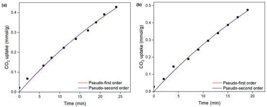 Pseudo-first- and pseudo-second-order models fitting (a) ZIF-76A and (b) ZIF-76B for the initial stage of CO2 adsorption at 298.15 K.