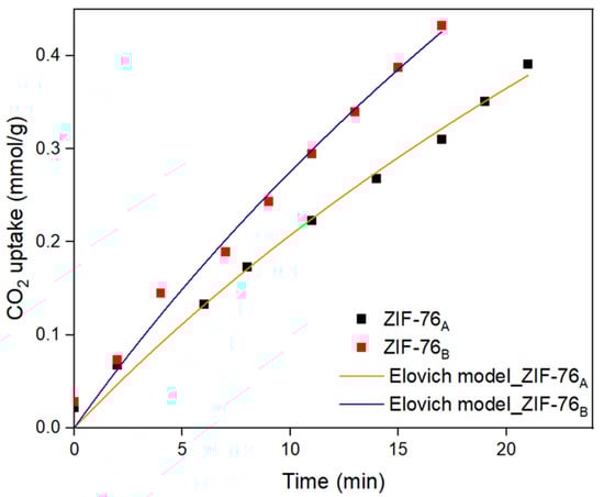 Elovich model fitting of ZIF-76A and ZIF-76B for the initial stage of CO2 adsorption at 298.15 K.