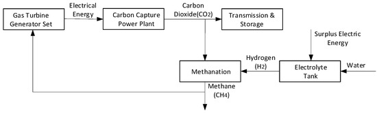 As illustrated in Figure 1, CCS technology captures CO2 from the flue gas emitted by fossil fuel-fired power units. Following separation and purification, the captured CO2 is transported to the methane reactor. Concurrently, an electrolyzer produces hydrogen through water electrolysis, which subsequently reacts with the captured CO2 to generate methane. The synthesized methane is then injected into the natural gas pipeline network to serve as a feedstock for gas turbines, thereby facilitating the recycling and efficient utilization of energy.