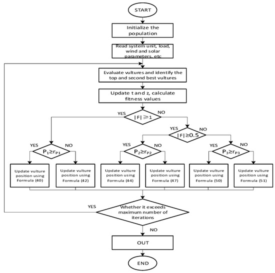 Upon the establishment of the initial population, the fitness of all solutions is computed, and the supremely optimal solution is selected as the first group vulture and the second-best optimal solution as the second group vulture, while the residual solutions move towards the first and second groups. During each fitness iteration, the entire population is recalculated [20].