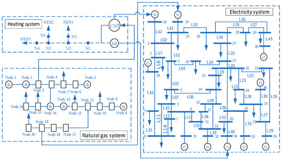 In this paper, a microgrid system is constructed by taking the IEEE-39 node power grid-20 node natural gas network-6 node thermal system as an example. The diagram of the integrated energy system is presented in Figure 3. It encompasses the IEEE-39 bus system, the twenty-node natural gas system in Belgium, and the six-node thermal system. Herein, the generator at Node 30 of the IEEE-39 node power system is configured as a CHP unit, which simultaneously serves as a heat source connected to Node 1 of the six-node thermal system. Node 34 is linked to the EB unit of the thermal system. The natural gas consumed at node 37 is supplied by node 19 within the natural gas distribution network, and the generator at node 37 is configured as a P2G-CCS unit. The 20-node natural gas system in Belgium comprises six gas sources and nine natural gas loads. The heat sources in the six-node thermal system include a CHP unit and an electric boiler, and the electric power consumed by the electric boiler is provided by the CHP unit. To enhance the coupling strength among electricity, gas, and heat, the CHP unit is designated as a gas-fired unit, and the natural gas it consumes is supplied by Node 3 of the natural gas system. The unit cost coefficients, parameters of gas and heat pipelines, etc. are provided in reference [29]. The parameters of diverse types of equipment are presented in Table 1, and the forecast values of wind and solar power are illustrated in Figure 4.