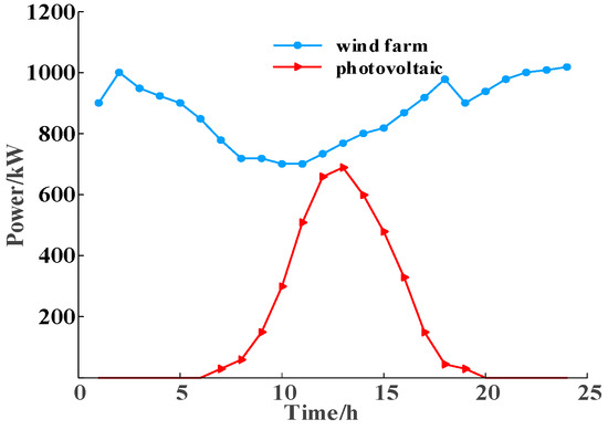As illustrated in Figure 4, the power generation from wind energy exceeds that of photovoltaic sources in 24 h. Accurate forecasting of wind and solar power output enables the power system to proactively plan and adapt its operational strategies. This includes optimizing generator configurations and the charge–discharge protocols of energy storage systems, thereby ensuring the stability and reliability of electricity supply. Such predictive data facilitates the maximization of renewable energy utilization and mitigates potential inefficiencies arising from unforeseen weather fluctuations.