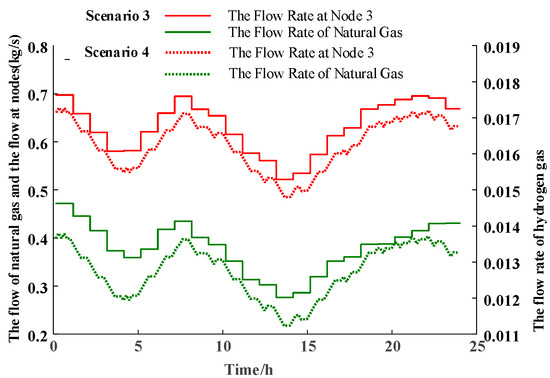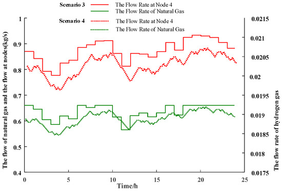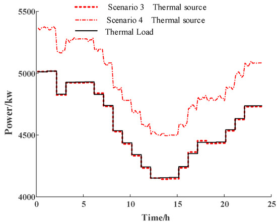The natural gas consumption of CHP units and GB, as well as the gas flow through the network nodes, are illustrated in Figure 6 and Figure 7, respectively. The heat source output is shown in Figure 8. Compared to Scenario 3, Scenario 4 exhibits a reduction in natural gas flow. This decrease can be attributed to the consideration of dynamic characteristics: when load demand increases, the system leverages the storage capacity of the gas network to reduce gas purchases; conversely, when load demand decreases, the units meet the demand by consuming natural gas, leading to reduced pipeline flow and more stable node flow fluctuations. Considering the thermal losses inherent in the heat distribution network, Scenario 4 requires increased heat source output, which clearly reflects the changes in natural gas flow within the pipeline. Given that CHP units provide both electrical and thermal energy, GB is primarily used for heating to minimize electricity consumption and gas procurement costs, resulting in higher natural gas consumption.