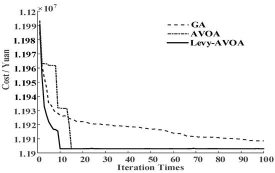 Concerning the convergence effect of the Levy-AVOA algorithm in problem-solving, this paper makes a comparison with the AVOA algorithm and the genetic algorithm (GA) in this respect. The comparison results are presented in Figure 9.