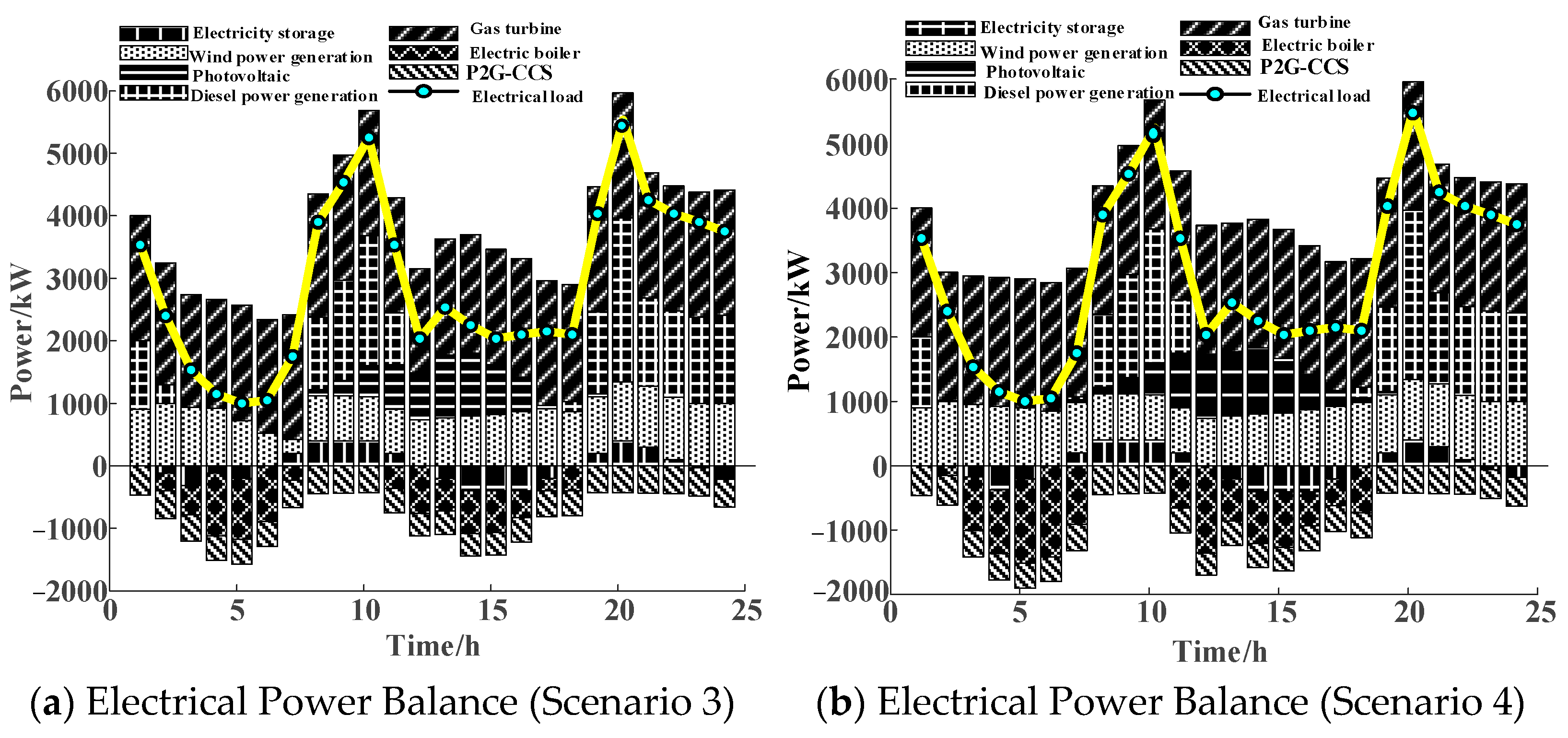 The power balance of the system in Scenario 3 and Scenario 4, respectively, is presented in Figure 5a,b. Taking into consideration the dynamic characteristics of the gas network and the heat network, the output of the diesel-generating unit declines at 01:00, while the output of the wind power generation unit rises at 07:00. In light of the relatively low demand for electrical load during the low electricity consumption period, the power supply requirements of the system can be fulfilled by the CHP and the wind-solar power units. When in the peak electricity consumption period, the output of the diesel-generating unit increases. At this point, the electrical energy is utilized for load supply, the power consumption of the electric boiler is zero, and the heat load is satisfied by the CHP and the GB. Due to the influence of the carbon trading strategy during dispatching, accordingly, in order to reduce carbon emissions, the heat output of the CHP decreases, and the electrical output of the CHP reduces in accordance with the heat-determined electricity strategy.