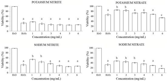 - Potassium nitrite: The results showed little cytotoxic potential of this additive, with a cell viability range between 117% and 82% compared to the control. The ADI concentration induced a stimulation of leukemia cell growth by 10% compared to untreated cells. Furthermore, the IC50 was not reached, which would indicate that our additive had chemopreventive potential for any of the concentrations studied.