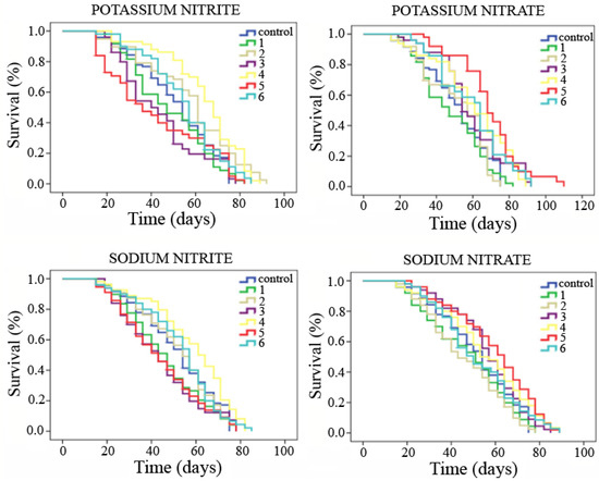 - Potassium nitrite: The longevity results indicated that concentrations 2 and 4 studied for this additive induce a significant improvement between 6 and 13 days of Drosophila lifespan extension when it is chronically fed. In contrast, at concentrations 4 and 6, the quality of life of these individuals is significantly reduced between 4 and 5 days compared to their control.