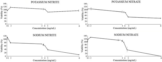 - Sodium nitrite: The viability percentage for cells treated with different concentrations of this additive was between 112% and 8% with respect to the control. The cytotoxic effect induced at the ADI concentration (concentration 3) indicated a cell survival of 71% related to the control. The IC50 was reached between concentrations 4 and 5 under study.