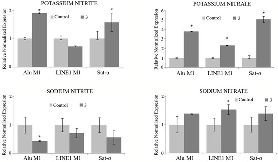 - Potassium nitrite: The results showed significant hypermethylation for Alu M1 and Sat- α repetitive sequences relative to the control.