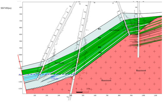 The basement complex was an assemblage of metamorphic and igneous rocks underlying stratified rocks [42]. The research target was a triangular closed fault block bounded by faults that had developed in three directions: northeast, northwest, and southeast. It featured the structural characteristic of being higher in the northeast and lower in the southwest, with the highest point located in the northwest. The formation dip angle reached up to 30 degrees. The shale interlayers within the oil reservoir in the block were unevenly developed and directly overlaid the fractured granite, with unified oil–water contact. In Figure 2, the structural and lithological characteristics of the reservoir are illustrated. The colors represent different geological units and features: fractured granite, overlying sandstone, and fault zones. The unified oil–water contact (blue line) indicates a single-temperature–pressure system.