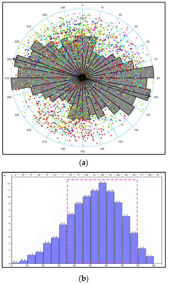 (a) Dominant fracture orientations in the NW-SE direction. (b) Dominant fracture with medium to high dip angles (40°–70°).