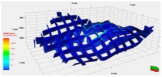 The 3D geological model is a three-dimensional visualization of the reservoir characterization results. It integrates multidisciplinary data to enable a quantitative 3D description and prediction of the geological features. A detailed 3D geological model was developed, resulting in a variable-depth corner-point grid system. A permeability model of the sandstone reservoir is shown in Figure 4. After coarsening, the planar grid size was 50 m × 50 m; the vertical grid thickness was 1 m for sandstone and 5 m for the basement. The block size of the fractured basement complex reservoir was 50 m × 50 m × 1 m, and DX-DY-DZ was 85 × 57 × 253 in the matrix and fracture grid.