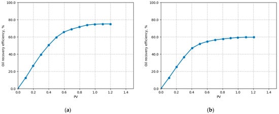 The displacement efficiency for these four different gases is summarized in Table 7. Four kinds of gases were used in long-core gas flooding efficiency experiments, and all of the results are shown in Figure 7. CO2 had the highest oil recovery efficiency, reaching 74.97%. This was because under the experimental conditions, CO2 achieved miscible pressure with the crude oil, forming a miscible phase that enhanced the oil recovery efficiency. APG had the second highest recovery efficiency, reaching 59.59%. It contained a certain proportion of light hydrocarbon components that could partially dissolve in the crude oil, improving its flow ability. Air had an oil recovery efficiency of 54.16%. It contained a small amount of oxygen, which could promote slight oxidation of the crude oil, though thus effect was limited. N2 had the lowest oil recovery efficiency, at only 51.64%. N2 did not dissolve in the crude oil and relied mainly on physical displacement, resulting in a relatively lower efficiency.