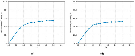 Oil recovery efficiencies of four gases (CO₂, APG, air, and N₂) from core flooding experiments. (a) Oil recovery efficiency for CO₂ gas flooding. (b) Oil recovery efficiency for APG gas flooding. (c) Oil recovery efficiency for air gas flooding. (d) Oil recovery efficiency for N2 gas flooding.