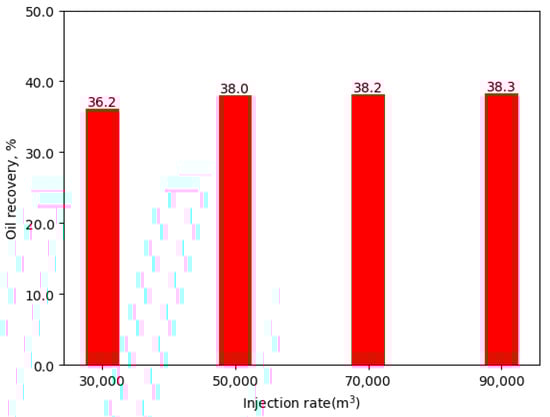 Based on the liquid production rate of the fractured basement complex reservoir, four gas injection cases were designed with daily injection rates of 30,000 m3/d, 50,000 m3/d, 70,000 m3/d, and 90,000 m3/d, and the oil recovery in these case is shown in Figure 10. By analyzing the oil increment effects in each case, the optimal gas injection rate was recommended. According to the data from the reservoir numerical simulation, a daily gas injection rate of 50,000 m3/d achieved a moderate increase in the reservoir pressure, effectively improved the crude oil’s mobility, and delivered the best oil recovery performance. When the gas injection rate exceeded 50,000 m3/d, the increase in the reservoir pressure diminished, and the incremental oil recovery effect no longer improved significantly. Excessive gas injection not only raised the operational costs but also increased the risk of gas channeling.