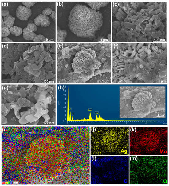 In addition, the prepared rGO, as shown in Figure 2d, displays densely arranged, multilayered, corrugated sheets-like morphology. The corrugation at the edges of the nanosheets is a result of the loss of oxygen-containing functional groups during the reduction process of GO. This reduction leads to strong attractions and interactions between the surface groups on the graphene-like layers [2,22,23]. After the incorporation of the rGO sheets into the AgM material, an AgM/rGO composite is formed and wrapped over the ball-like cluster of AgM, as depicted in Figure 2e–g. AgM morphology is maintained after incorporation with rGO nanosheets, providing more active sites that facilitate greater ion adsorption [24]. Furthermore, the EDX and mapping analyses in Figure 2h–m demonstrate the homogenous distribution of Ag, Mo, O, and C in AgM/rGO composite, signifying a synergistic effect that enhances electron/ion transport, improved stability, and facilitated redox activity, contributing to efficient electrochemical performance [25,26,27].
